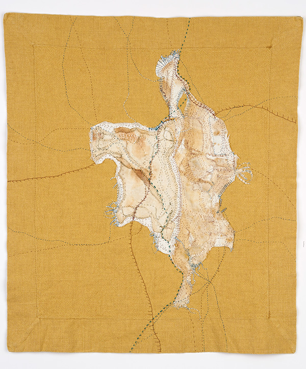 Record of the Journey 20 x 18". Cotton and linen fabric, gauze, thread.