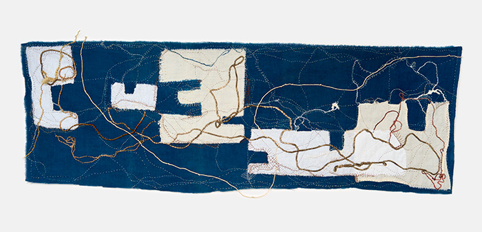 Atmospheric River 23 x 11". Fabric, string, thread.