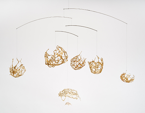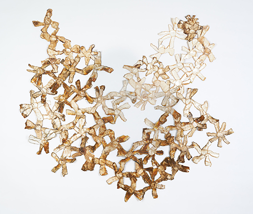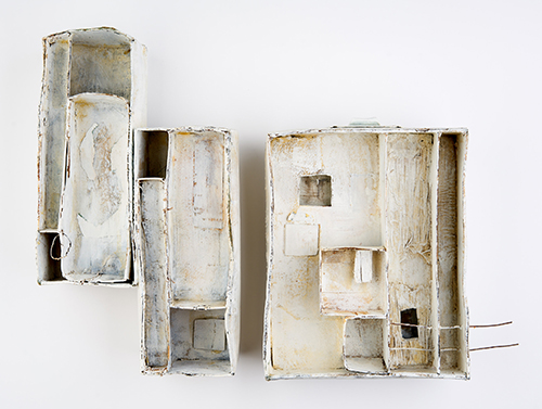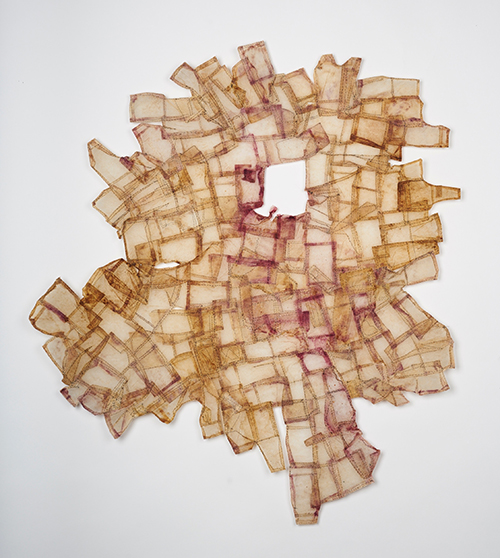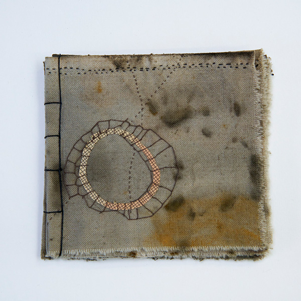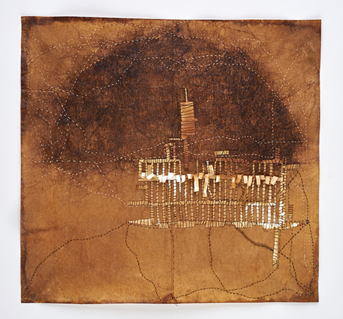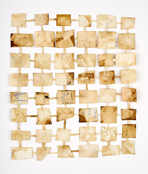 I work with repurposed or found materials that have been worn and used and worked by other people, other forces. My pieces are made from items such teabags and teabag labels, ledger paper, staples, coffee filters, cardboard boxes, zipper packaging, books, recipe cards, envelopes, discarded wire and wood. I add my efforts to the already present scratches, stains, dents, tears, rust marks and various weatherings with stitches, dye, paint and glue. I sand, boil and bake paper and books. I knead mulberry paper to get it to contract and adhere. The idea is to tell a story, but in hints and whispers, erasures, and mendings.