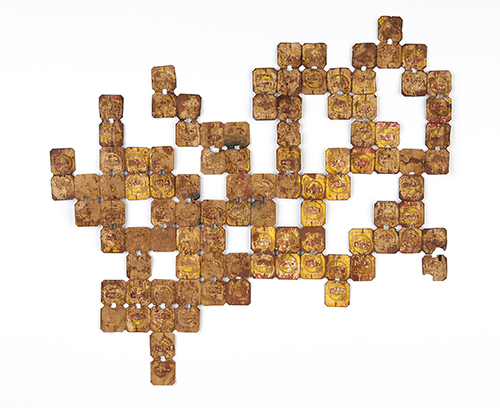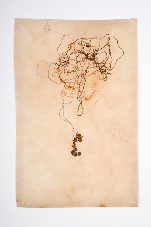 Imagine Knowledge 16 x 23". Fabric, string, thread, rusty metal.