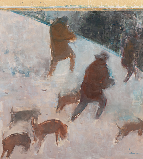 HUNTERS. FIRST SNOW 22x20", oil & gold leaf on mylar on panel $6,300 [Framed] |