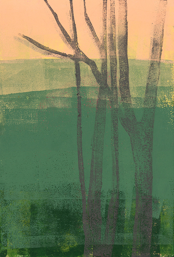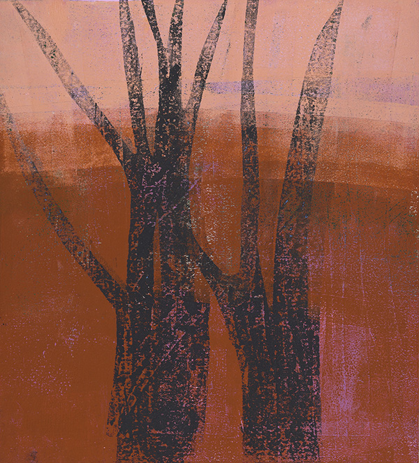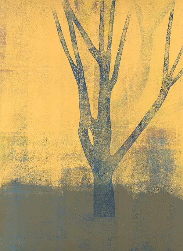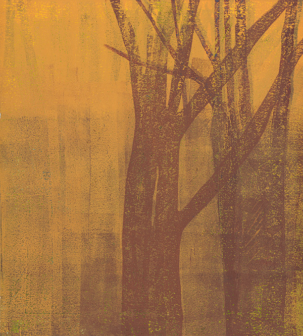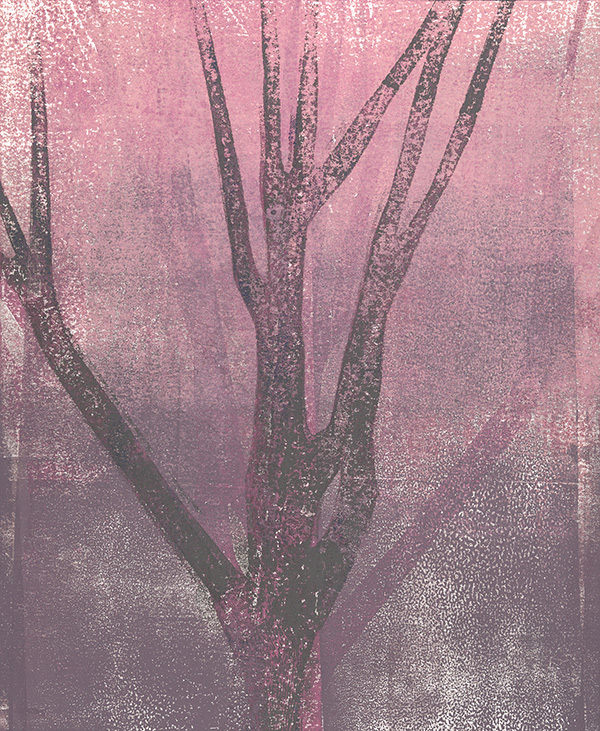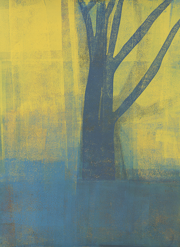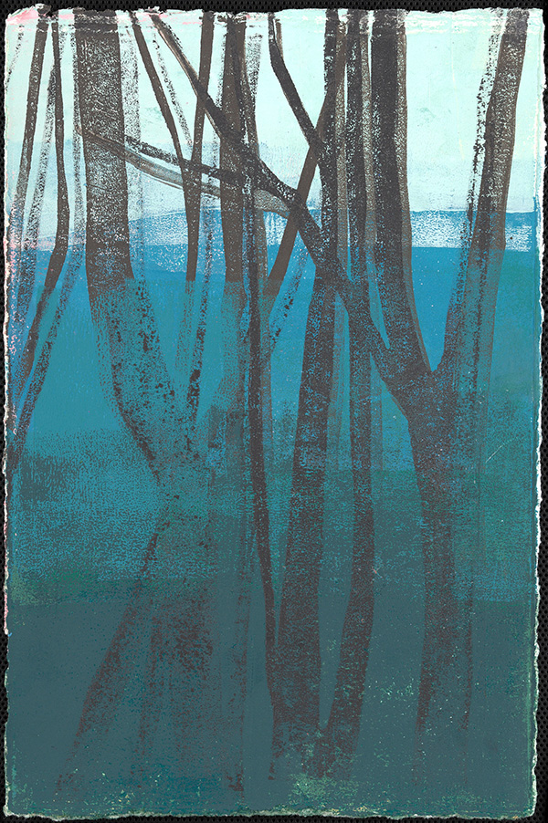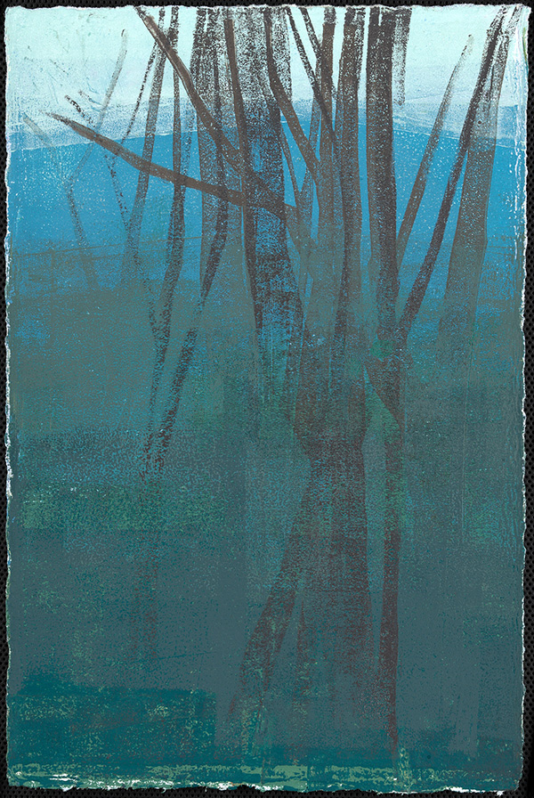 This body of work began as expressions of grief and loss, of presence and absence—subtle shifting states that evolved, more broadly, into meditations on being. These "treescapes" (a combination of mono-printing and painting) are at once intimately known, like I know my own hands (which are like my mother's) or the way my babies felt in my arms, and they are also as unknown and mysterious as what the next moment will be (and bring) when it arises. Titles -"An Opening, "Emergence," "Generations," "Meditations on Being" and so on—merely point to the ineffable experience of making these images. Trees have been a theme my whole career, but in this work, it's as if the trees and I have merged.