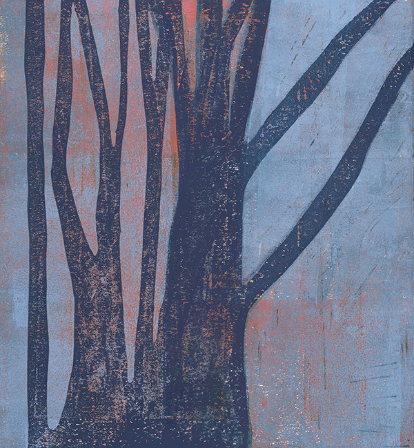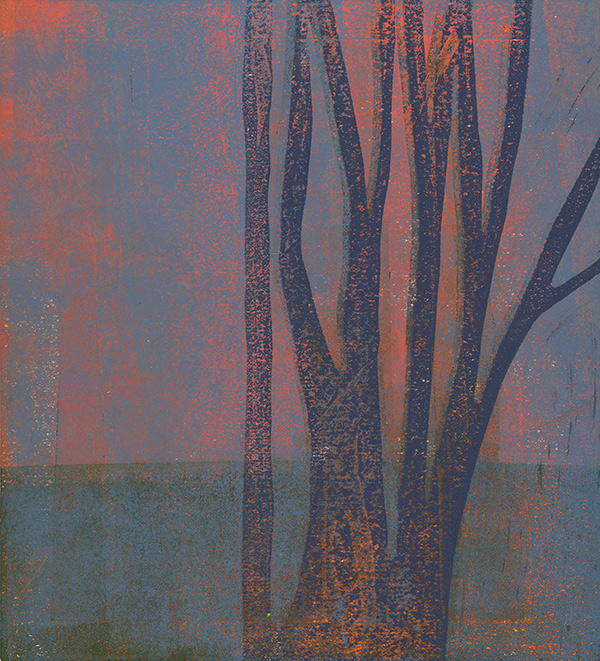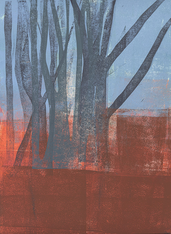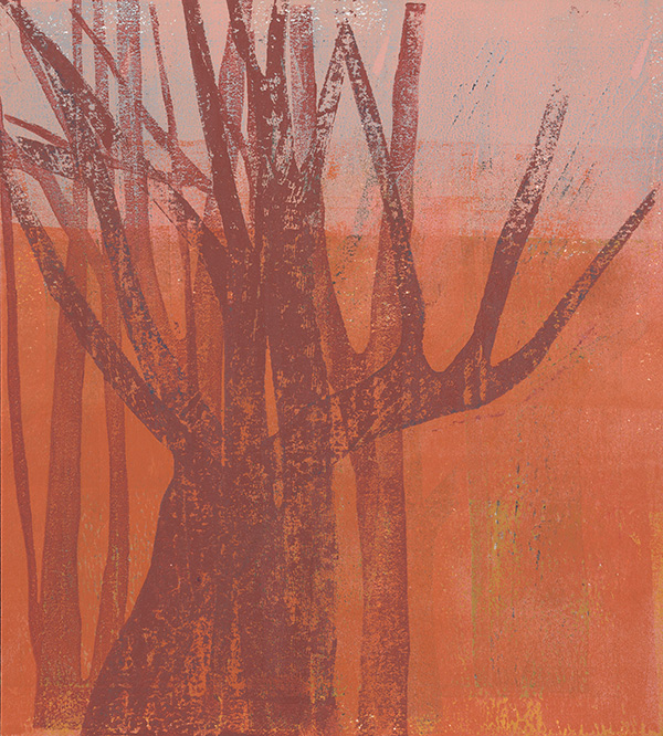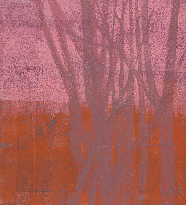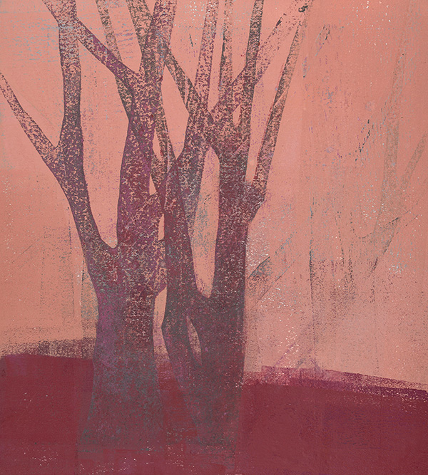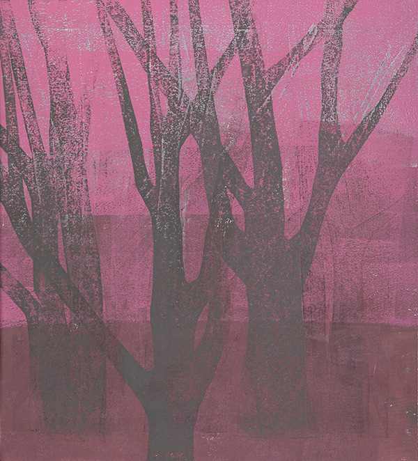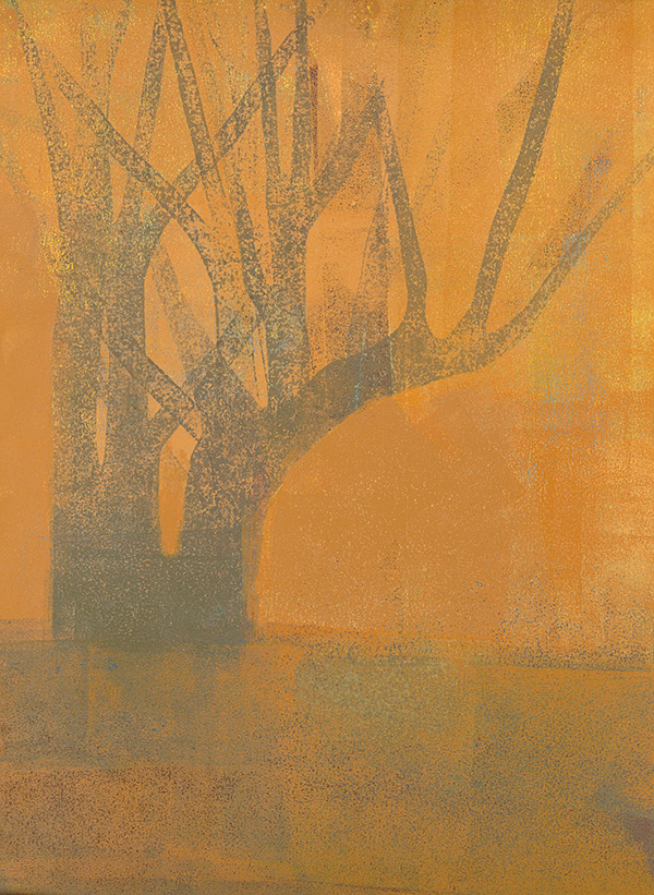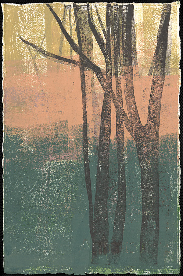 This body of work began as expressions of grief and loss, of presence and absence—subtle shifting states that evolved, more broadly, into meditations on being. These "treescapes" (a combination of mono-printing and painting) are at once intimately known, like I know my own hands (which are like my mother's) or the way my babies felt in my arms, and they are also as unknown and mysterious as what the next moment will be (and bring) when it arises. Titles -"An Opening, "Emergence," "Generations," "Meditations on Being" and so on—merely point to the ineffable experience of making these images. Trees have been a theme my whole career, but in this work, it's as if the trees and I have merged.